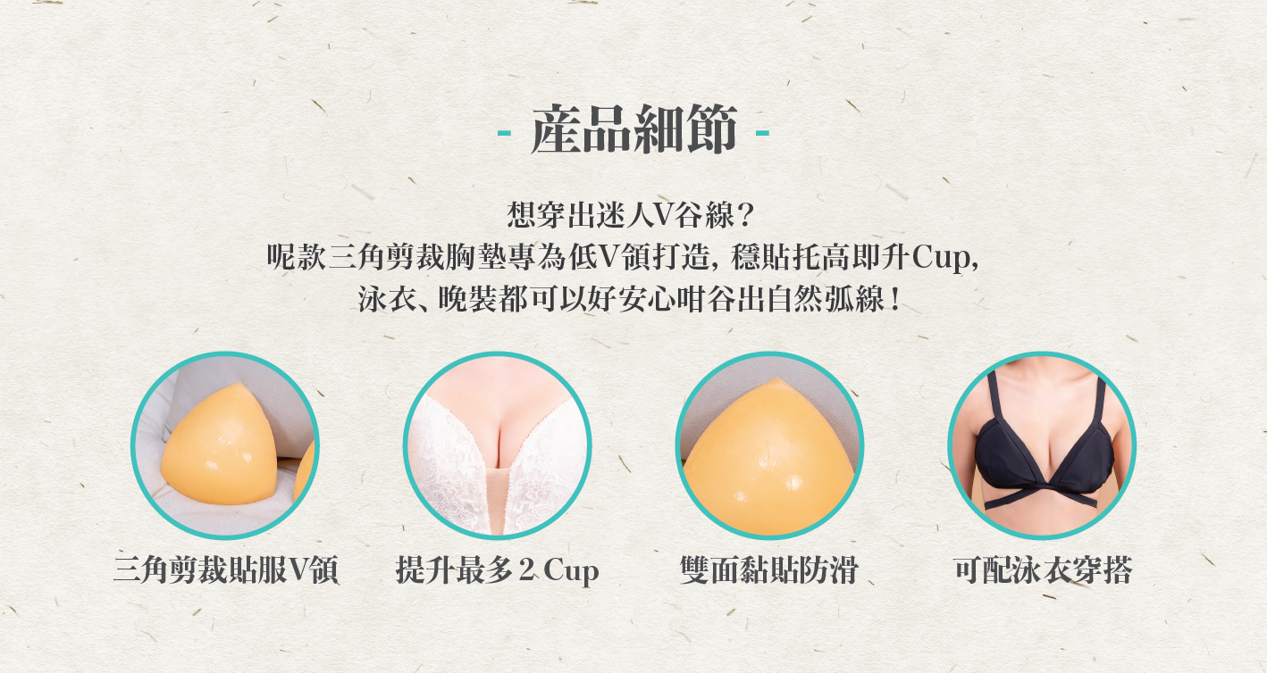想穿出迷人V谷線?呢款三角剪裁胸墊專為低V領打造,穩貼托高即升Cup,泳衣、晚裝都可以好安心咁谷出自然弧線!